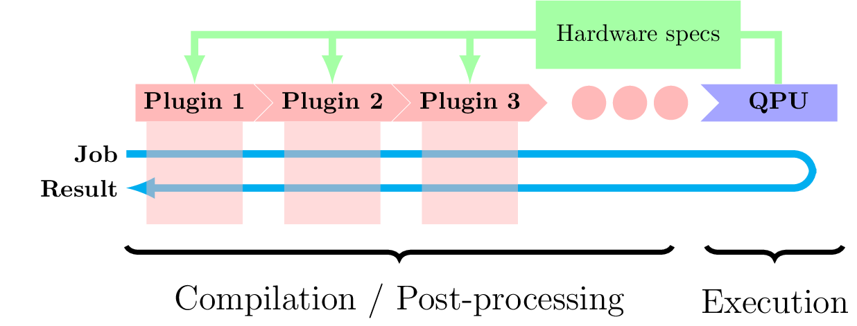 In this code, when a fresh batch or job is submitted, the batch will run through the compile of plugin1, the resulting batch will run through the compile of plugin2, etc. When reaching my_qpu the execution will start, and the results will be processed in reversed order on their way back.