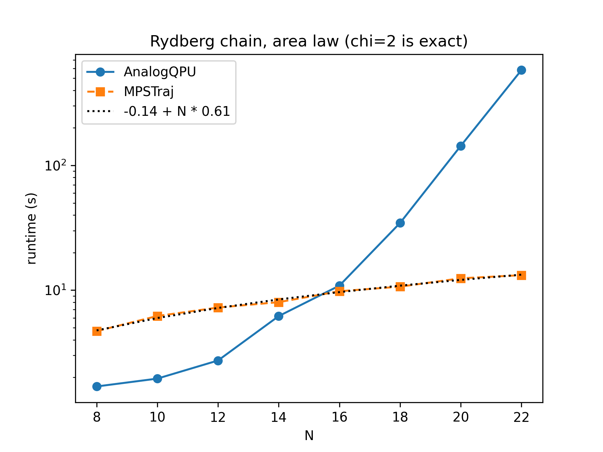 Below we show the runtime of emulating a standard quantum annealing schedule for preparing antiferromagnetic states in Rydberg atom systems, in the absence of noise. For a 1D chain of \(N\) atoms, entanglement is very low (area law), so that a bond dimension as low as \(\chi=2\) is almost exact. In that case we see a wall time that grows linearly with \(N\), to be compared to an exponential for AnalogQPU.